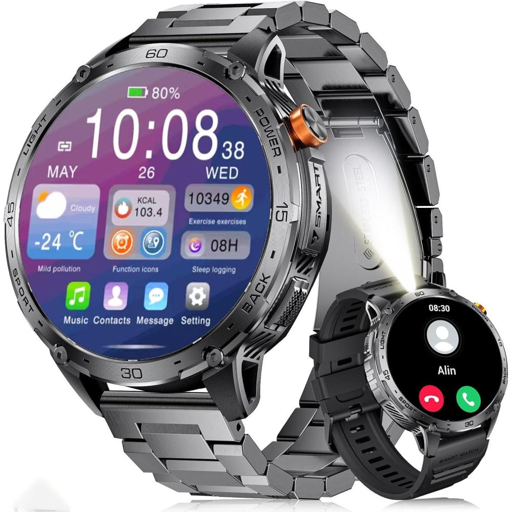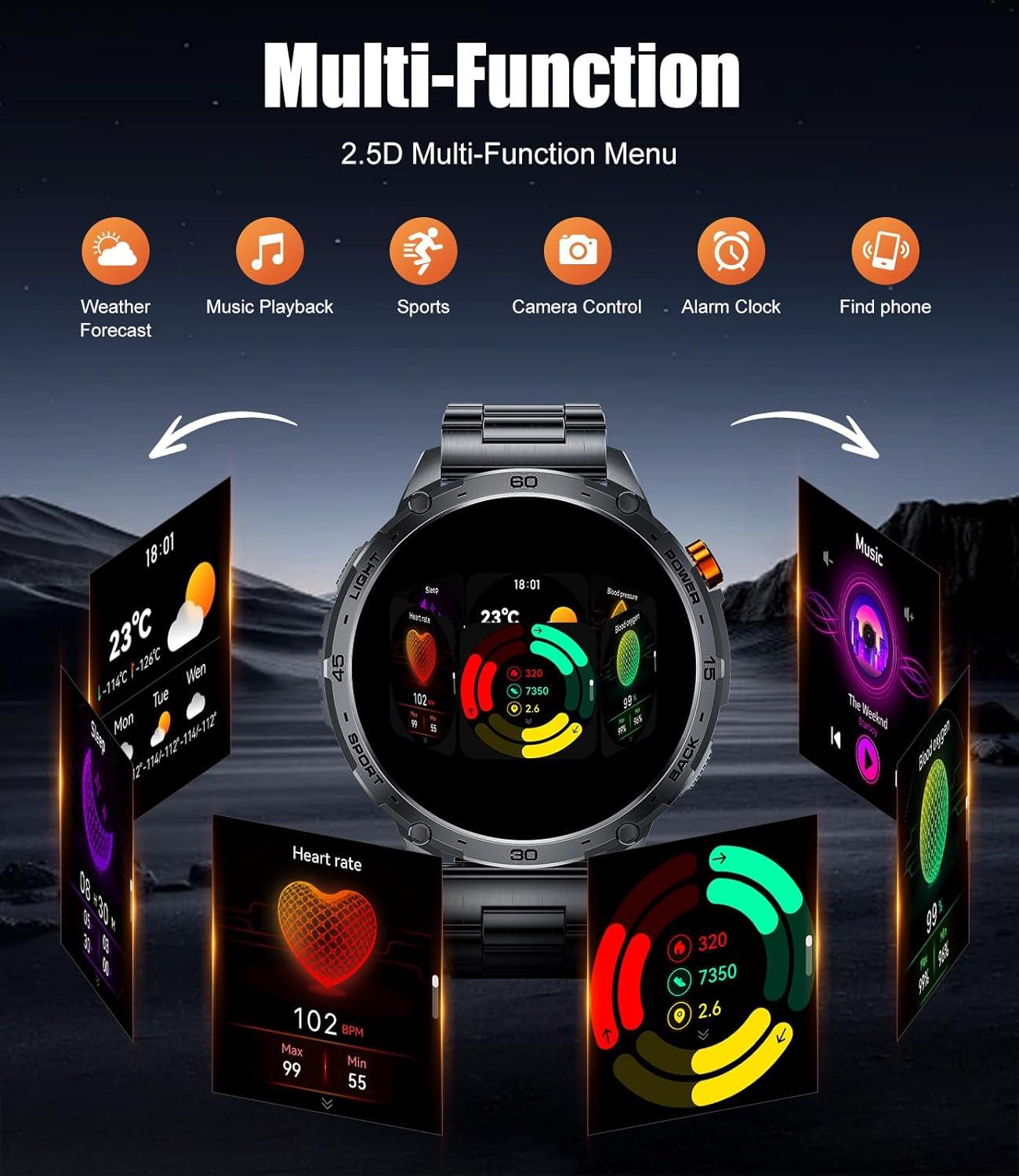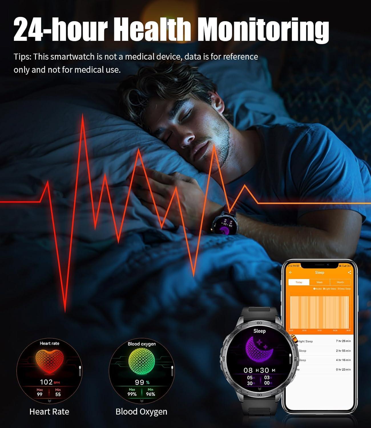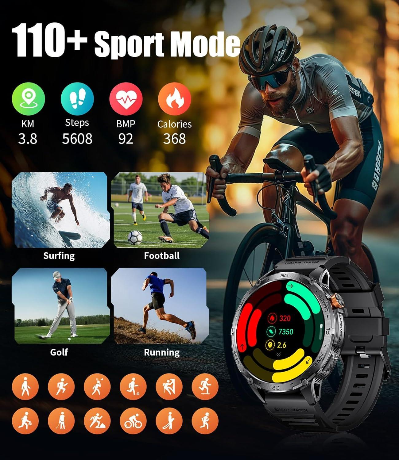 【130+ Sports Modes for Every Workout】: With over 130 built-in sports modes, this military watches for men caters to fitness enthusiasts with comprehensive activity tracking (20 built-in + over 110 available via the app). Whether running, cycling, swimming, or practicing yoga, the TX2 allows you to track your performance and monitor your progress in real-time. Stay on top of your training goals and improve continuously with its detailed fitness tracking features.