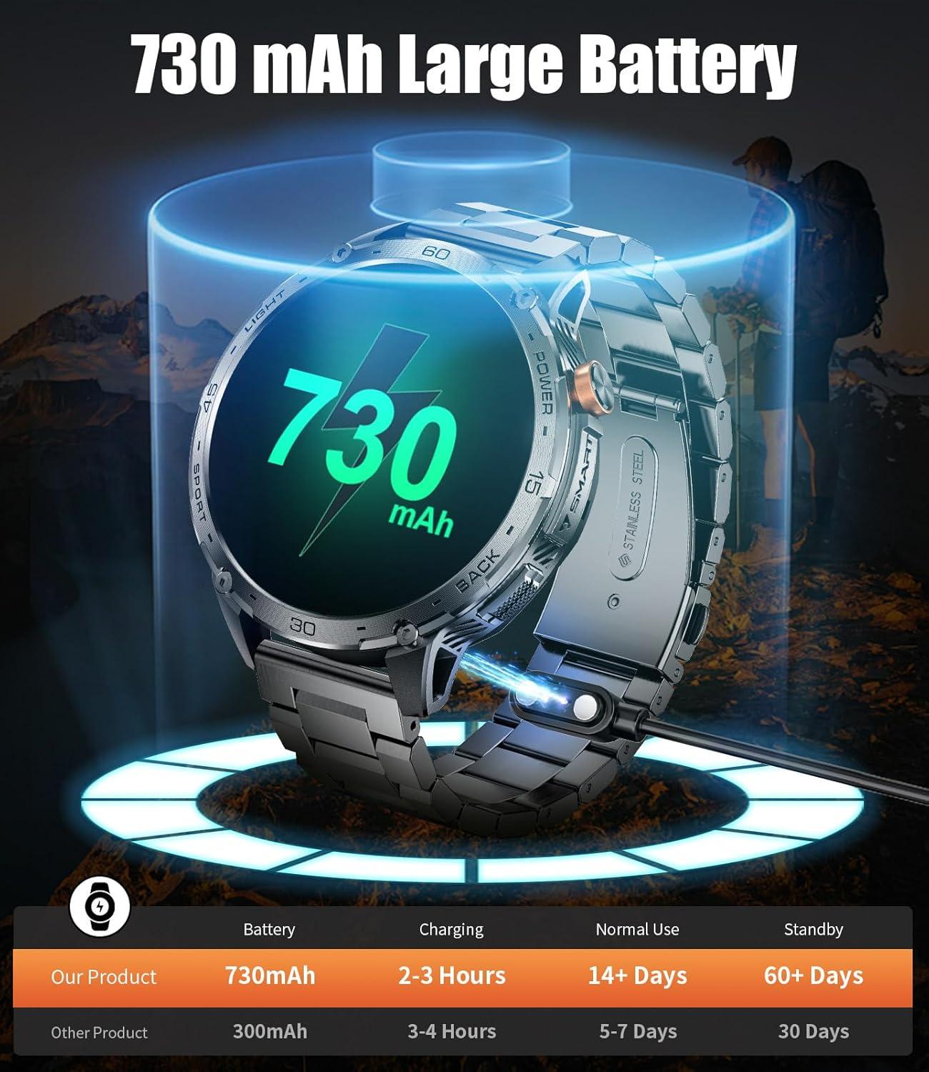 【Durable 730mAh Battery & 2 Bands】: The powerful 730mAh battery of the TX2 silver smartwatch provides an impressive over 58 days on standby. The smart watch comes with two different bands: a sleek metal band for formal occasions that gives it a premium, stylish look, and a comfortable silicone band perfect for sports and casual activities. This gives you the flexibility to switch between styles based on your needs and mood.