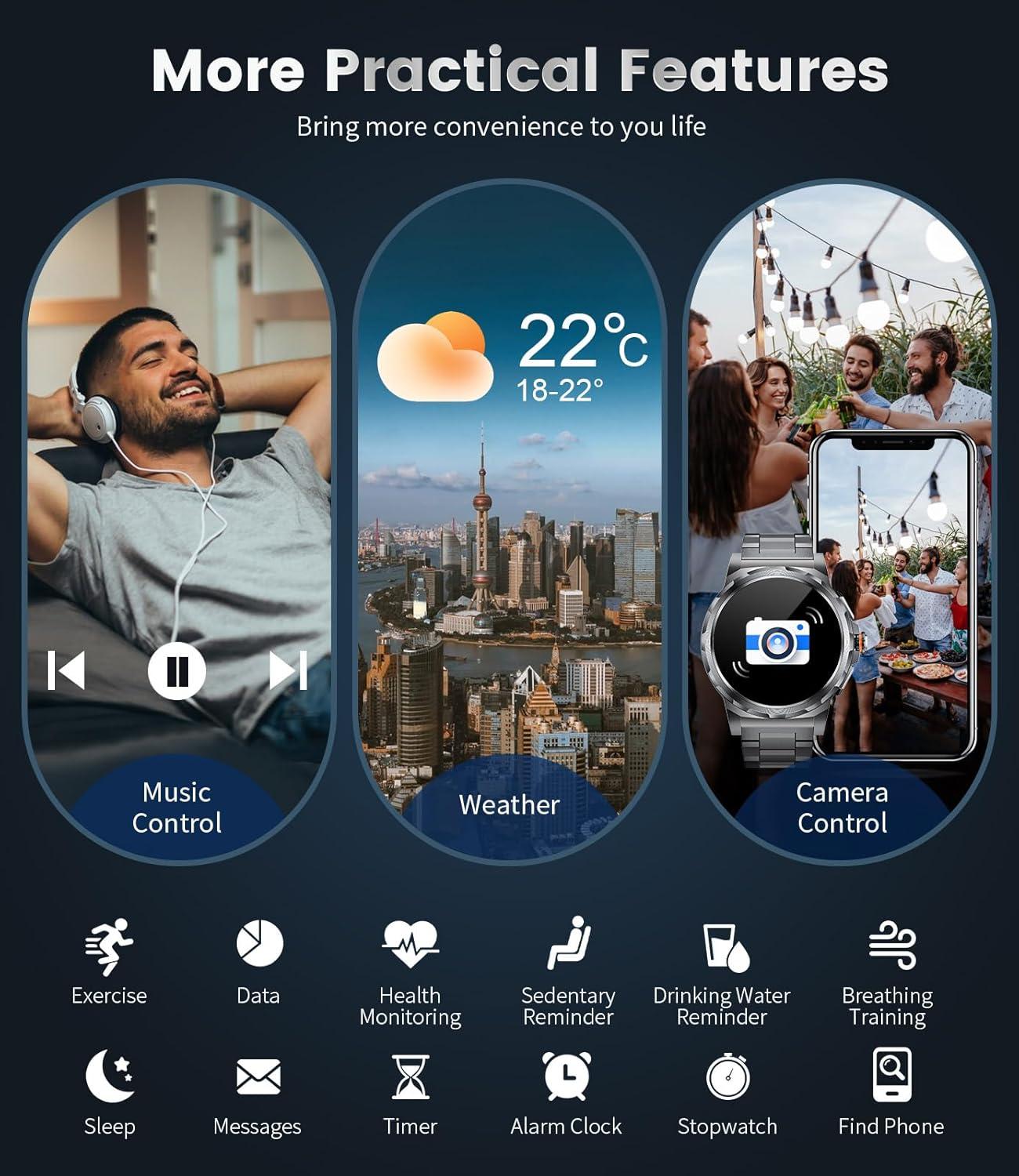 【2 straps & Multifunctional】:This round smart watch for men comes with two types of straps: a black stainless steel band, a black silicone band. The stainless steel strap is durable, easy to clean, and its metallic finish enhances a man's sophisticated style. The silicone strap is soft and skin-friendly. You can choose between the two styles as you like.This smartwatch features music control, remote camera, weather forecast, Bluetooth calling, message notifications, sports monitoring, sleep monitor,etc., making it your best life assistant.