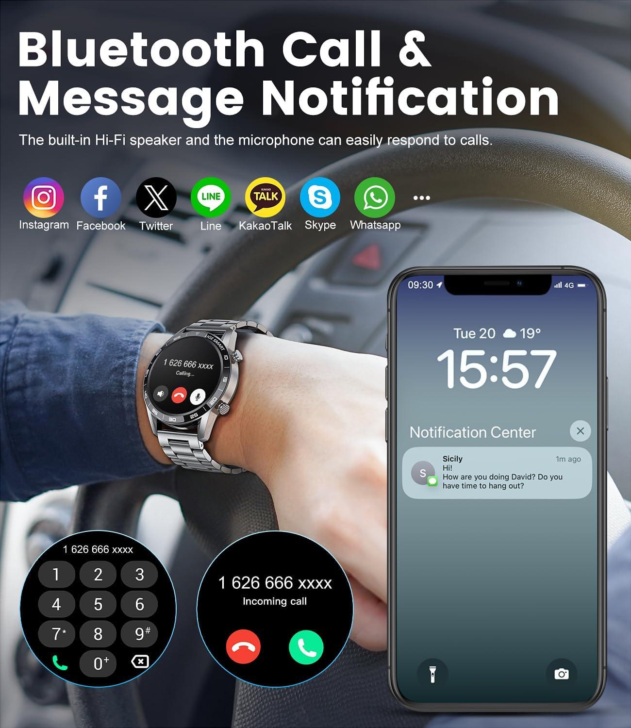 ✔️ More Practical Smartwatch : This mens smart watch comes with stainless steel band and silicone band, featuring rejected call SMS reply, 200+ dials, always on display, weather forecast (real-time UV/humidity), mood/stress monitoring, voice assistant, music playback, camera control, alarm clock, stopwatch, sedentary reminder, drinking water reminder, breathing training, find phone/watch, calculator. Support Android and iOS phones (Android 5.0+, IOS 9.0+, HarmonyOS 2.0+).