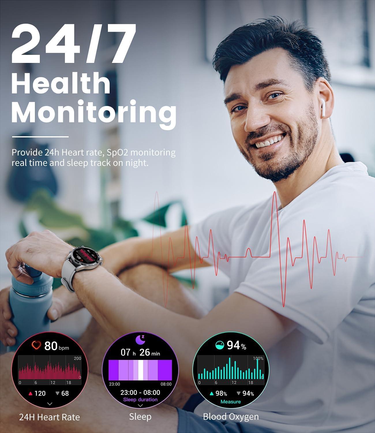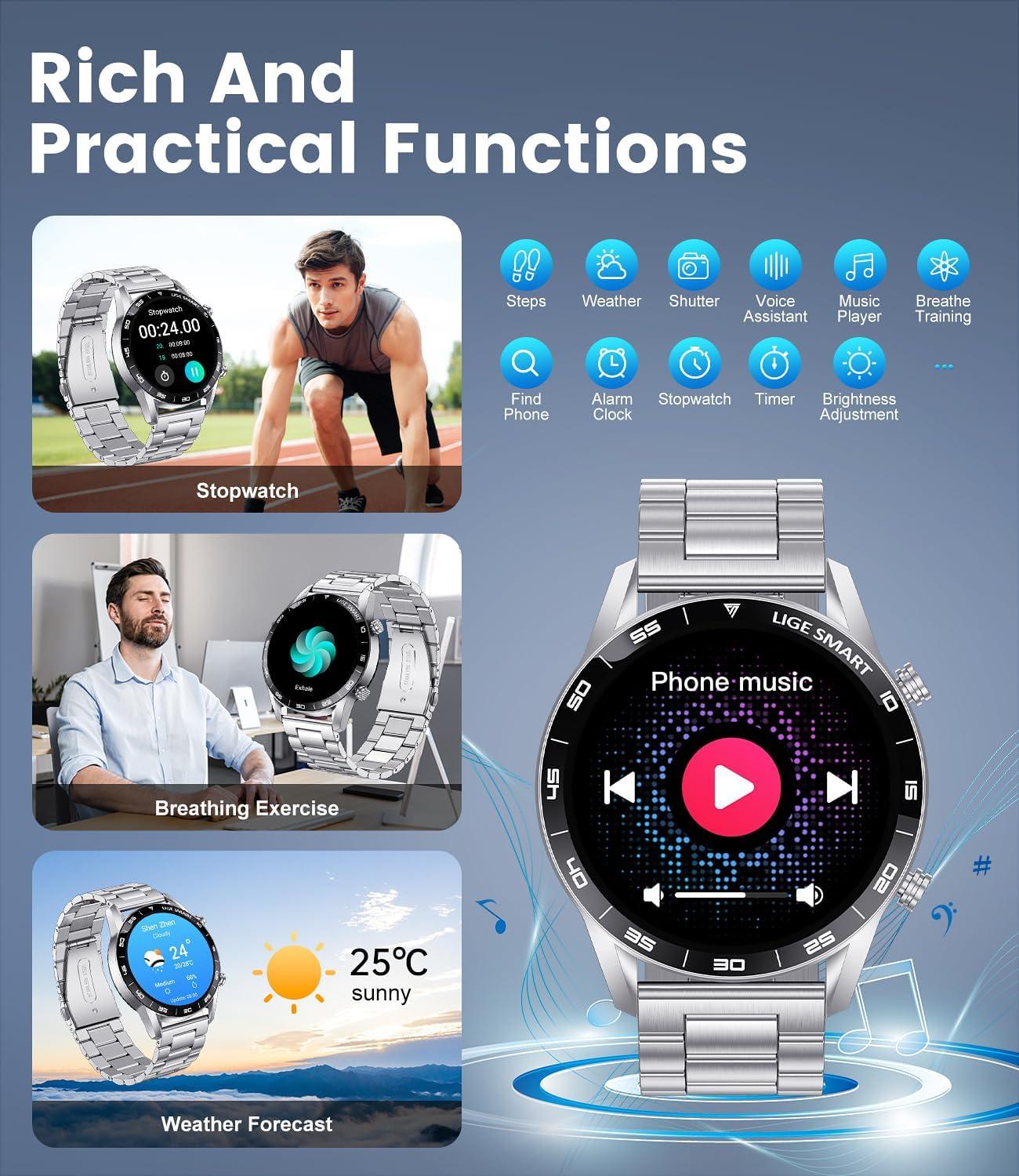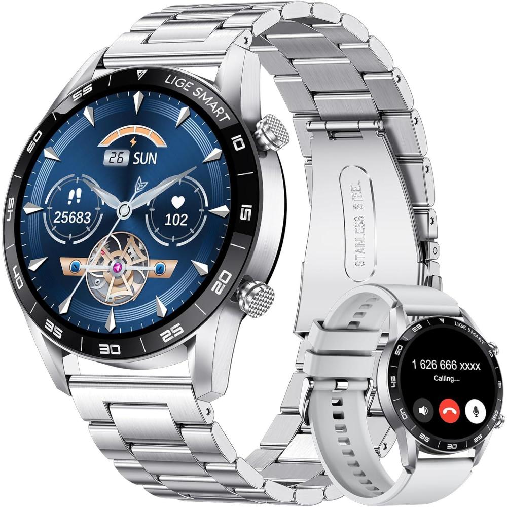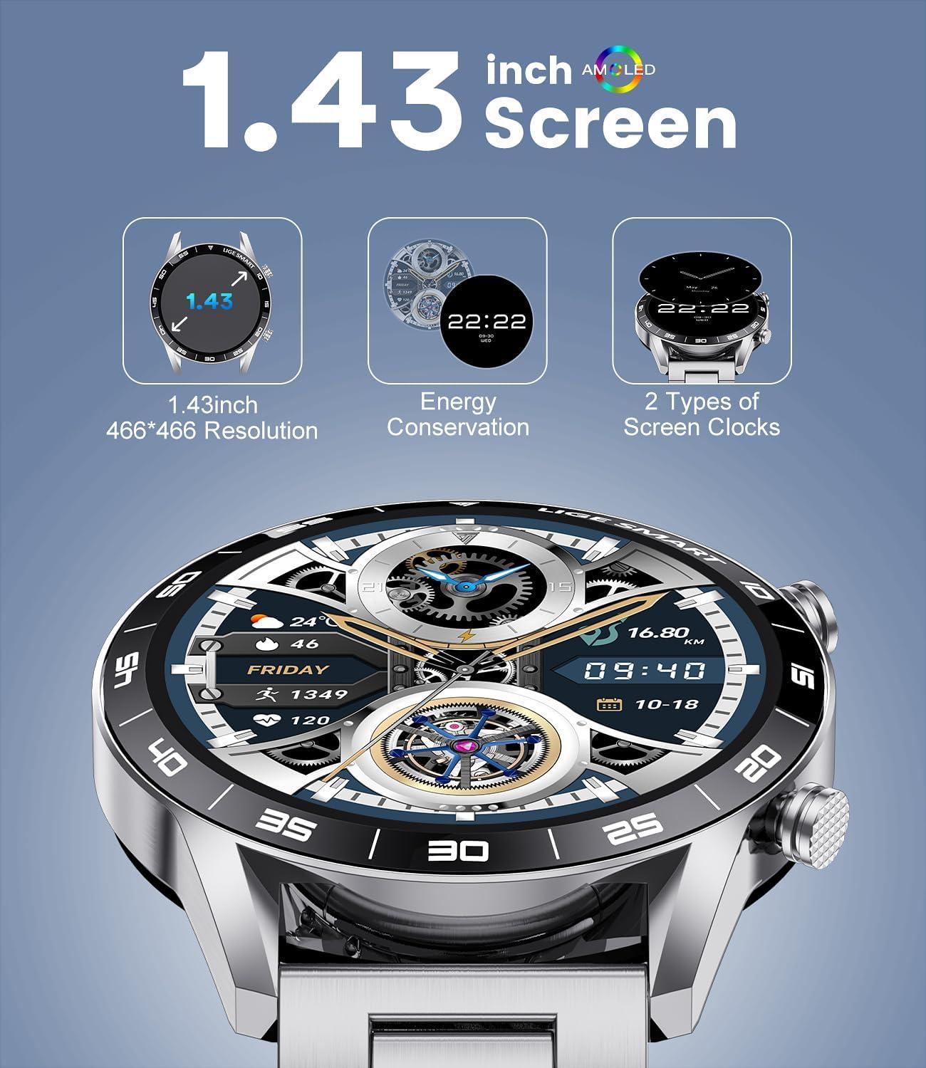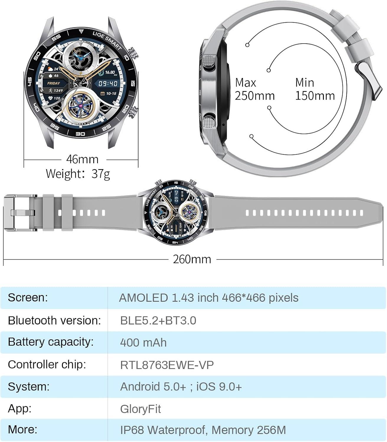 ⌚ 1.43″ AMOLED Smart Watch : The newly upgraded LIGE smartwatch is equipped with 1.43″ 466*466 high-resolution ultra-clear IPS screen, with rich screen colors, smooth touch control, and low-power Always on Display analog/digital clock for you to check the time conveniently. The rugged smartwatch successfully passes 12 U.S. MIL-STD-810H standard military-grade tests to meet your outdoor adventure needs.