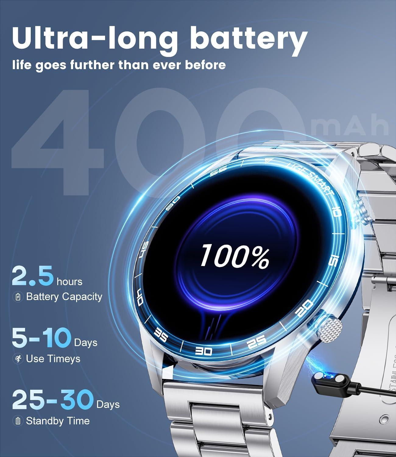 🔋 IP68 Waterproof / 400mAh Battery : The fitness watch is IP68 waterproof, which is good for daily life, such as hand washing, sweat and rain. The thin and lightweight classic round smart watch has a 400mAh battery, providing you with longer battery life, 5-7 days of daily use and 30 days of standby time.