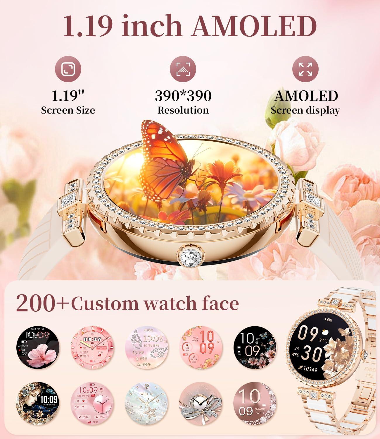 LIGE Smart Watches for Women with Diamonds for Android iOS, 1.19″ AMOLED Smartwatch with 24/7 Heart Rate, Sleep Monitor, IP68 Waterproof, Make/Answer Call, 110+ Sport Modes, Ceramic Strap, Rose Gold